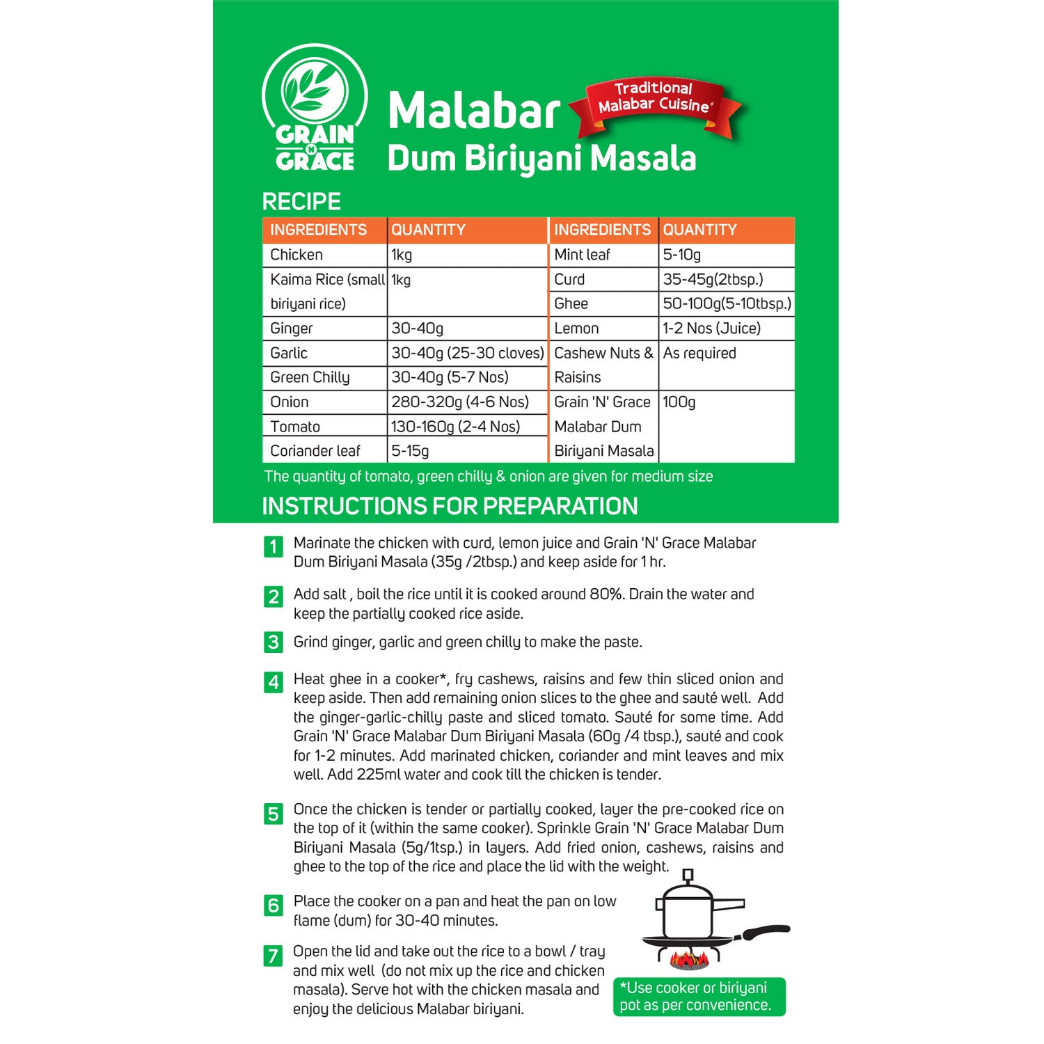 Experience the perfect blend of flavors that make up Malabar Dum Biriyani Masala. This mix of masalas, spices, and condiments has been carefully developed to provide the ideal spice level for an authentic and aromatic biriyani. Add a 100g pouch to your next meal and get ready to savor the signature taste of Malabar biriyani. Transform your cooking with our premium Spice Blends.